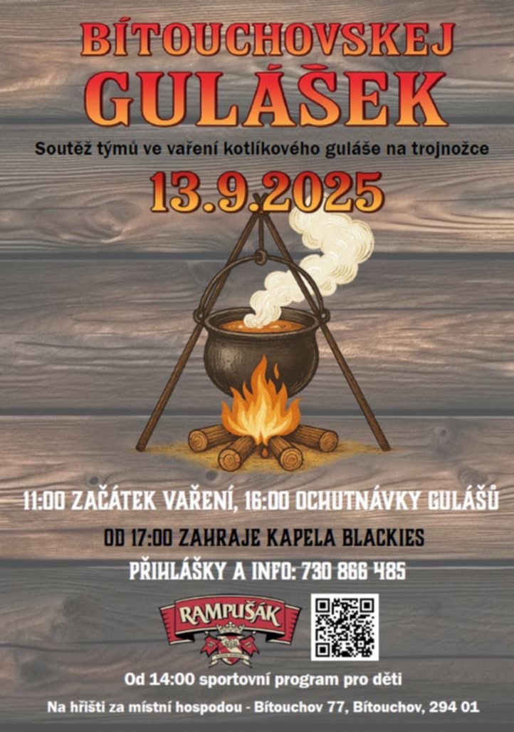 Nadšenci ve vaření kotlíkové guláše Vás zvou na soutěž, která se koná 13.9.2025 od 11 hodin na hřišti v obci Bítouchov.