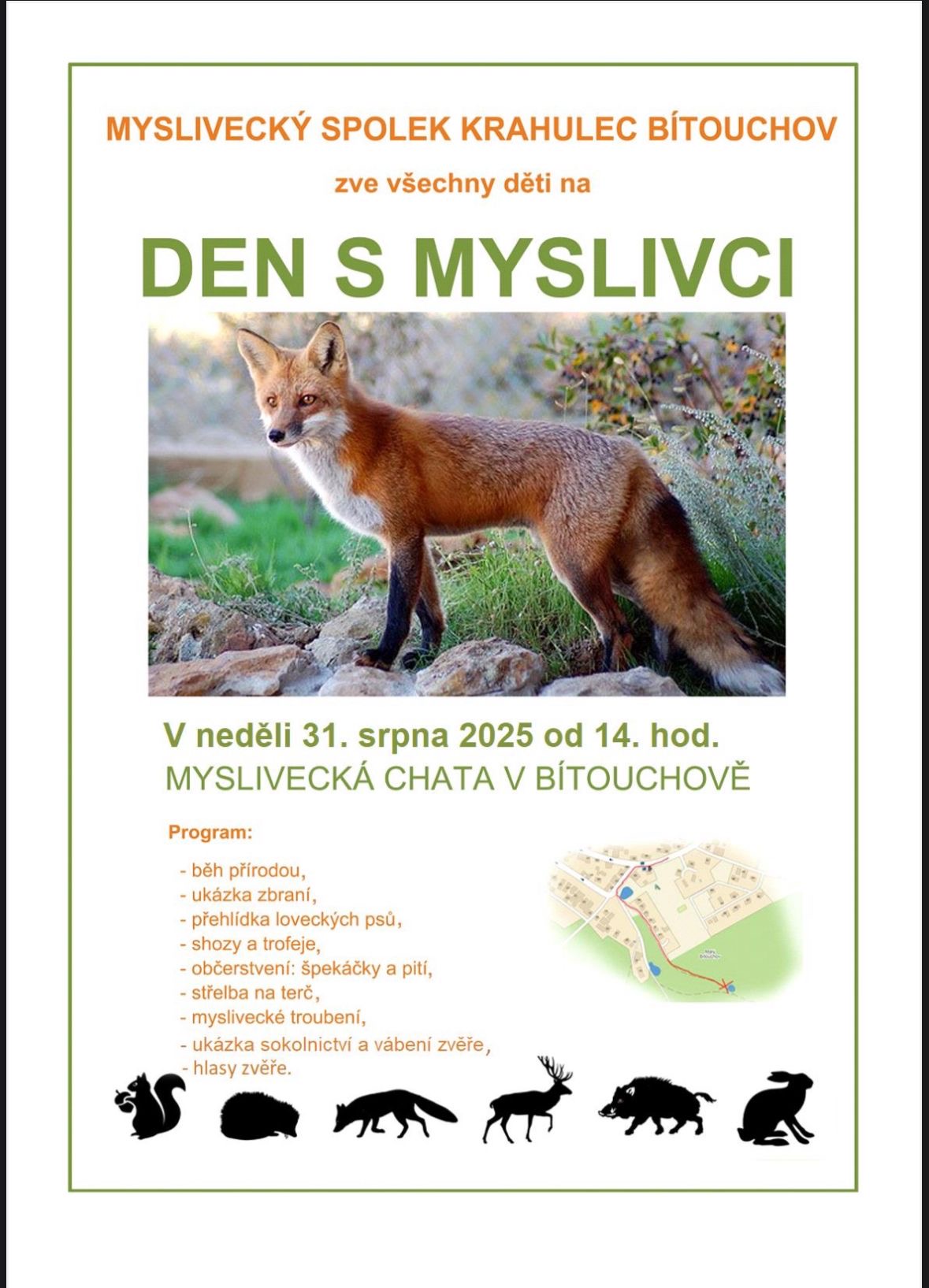 Myslivecký spolek Krahulec Bítouchov Vás zve na každoroční akci pro děti na konci letních prázdnin, která se koná dne 31.8.2025 na myslivecké chatě v obci Bítouchov od 14 hodin.